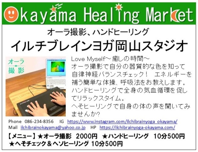 参加費:オーラ撮影2000円、ハンドケア10分500円、へそチェック&へそヒーリング体験10分500円