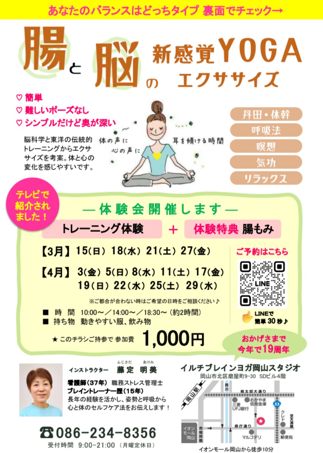 丹田たたき、腸運動、ブレイン体操、呼吸瞑想、腸チェック 開催日:3月15日(日)18日(水)21日(土)27日(金) 時間:10:00~、14:00~、18:30~(約2時間) 会場名:イルチブレインヨガ岡山スタジオ 会 […]