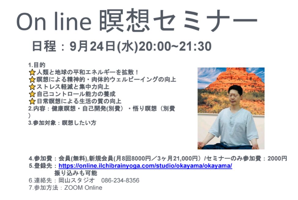 丹田たたき、腸運動、ブレイン体操、呼吸瞑想、腸チェック 9月14日㈰,17日㈬、20日㈯、24日㈬、28日(日) 時間:10:00~21:00 会場名:イルチブレインヨガ岡山スタジオ 会場住所:岡山市北区磨屋町9-30 […]